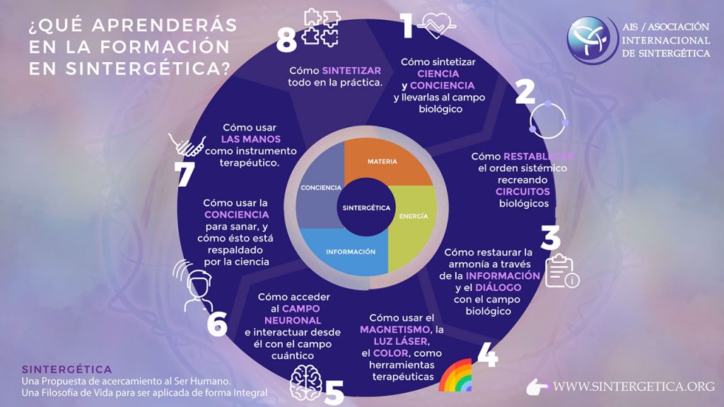 Durante la formación en Sintergética se abordan las reflexoterapias, la biocibernética y las biorresonancias, el bioelectromagnetismo y la biología de la luz y la neurosintergia, bajo el prisma de la Sintergética.